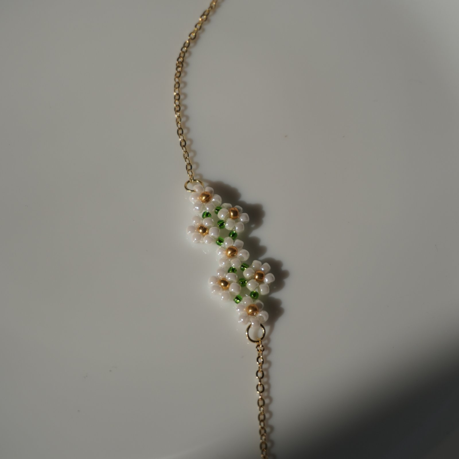 Celebrate elegance with this beautifully handcrafted floral beaded bracelet. Designed with intricate white bead flowers, subtle green crystal accents, and gold-tone center detailing, this bracelet offers a graceful and charming look.