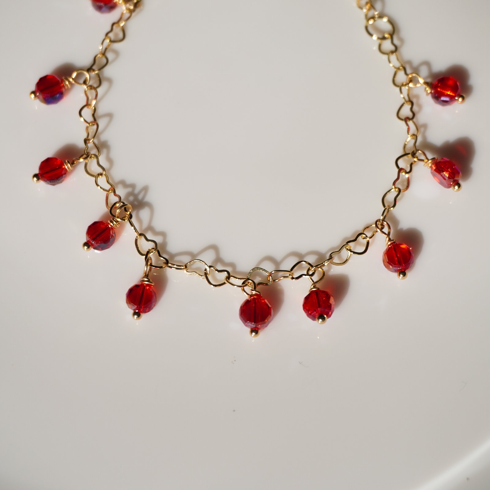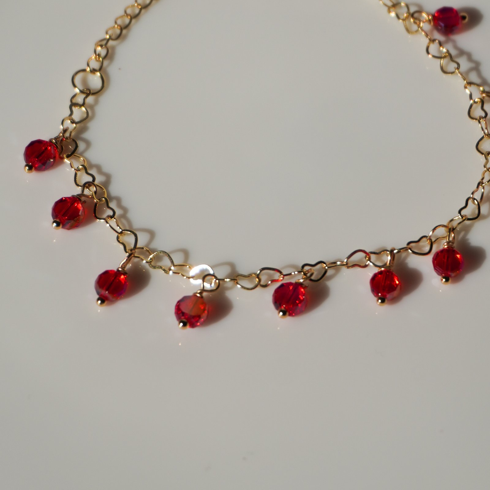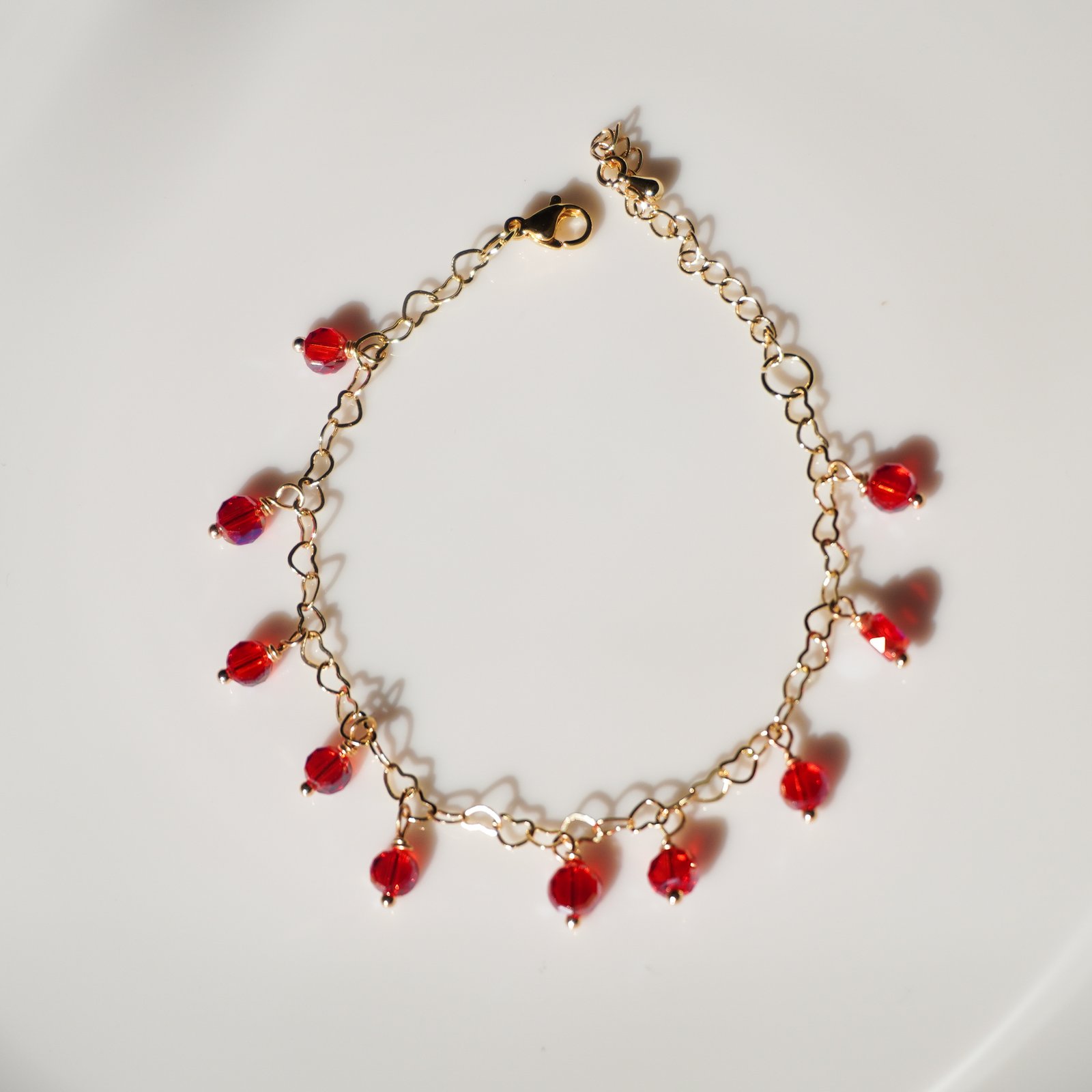 Each crystal bead is carefully wire-wrapped and attached to the chain, giving the bracelet movement and a delicate jingling charm when worn. The rich ruby-red color paired with warm gold tones makes it perfect for festive outfits, special occasions, or stylish daily wear.