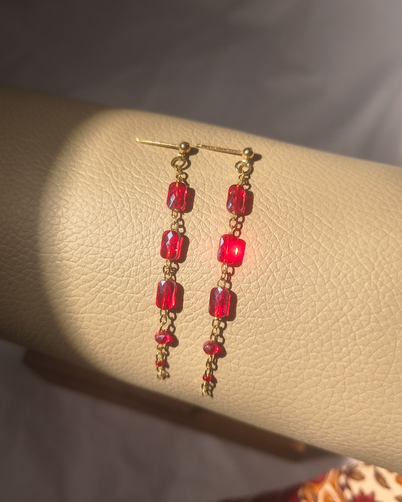 “Making a statement 💎 Red crystal beads, bold and beautiful, these earrings are more than just an accessory – they’re a declaration of confidence. Perfect for when you want to add a pop of energy to your look, turn heads at a party, or simply feel like the fierce version of yourself. Handcrafted with love, worn with passion, these red crystal beauties are sure to spark conversations and ignite your style.